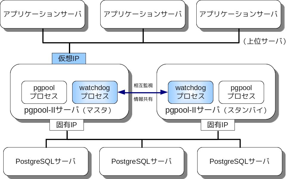 この結果、フェイルオーバ時には必ずpgpoolへのセッションが一端切れることになります。 こうしないと、ネットワークケーブル抜けなどの際に、 TCP/IPのレイヤで再送が行なわれ、長い時間そのままになってしまうことが あるからです。