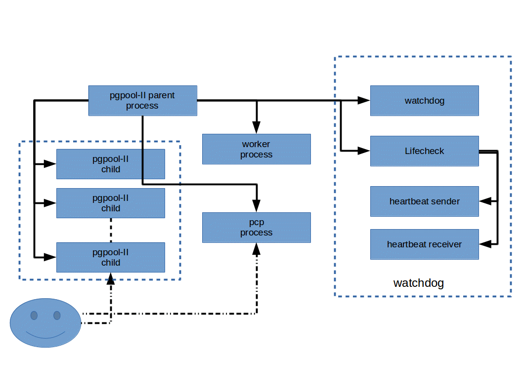 Pgpool-II consists of multiple process. There is a main process, which is the parent process of all other process. It is responsible for forking child process each of which accepts connections from clients. There are some worker process those are forked from the main process as well, which is responsible for detecting streaming replication delay. There is also a special process called "pcp process", which is solely used for management of Pgpool-II itself. Pgpool-II has a built-in high availability function called "watchdog". Watchdog consists of some process. For more details of watchdog, see Chapter 2.