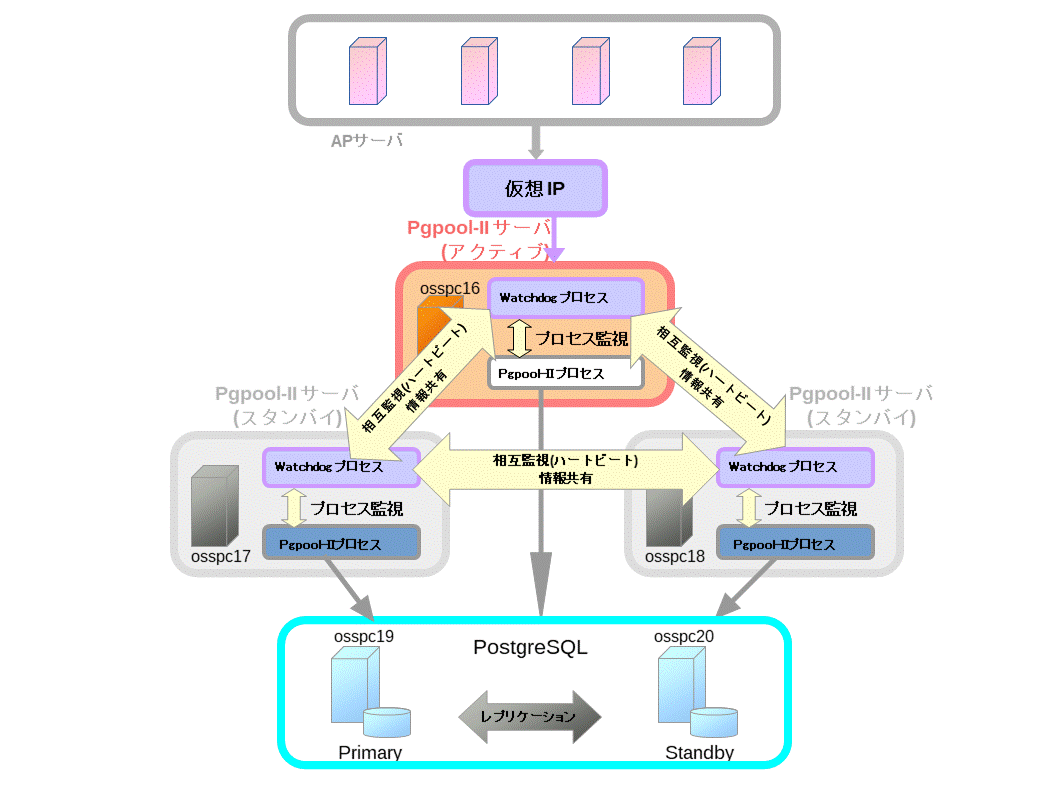 今回は、Linux サーバ 5 台を用意し、それぞれのホスト名は 「osspc16」、「osspc17」、「osspc18」、「osspc19」、「osspc20」 とします。使用するOSはすべてCentOS7とします。Pgpool-II3台 +PostgresQL2台(ストリーミングレプリケーション)の全体構成図は以下の通りです。