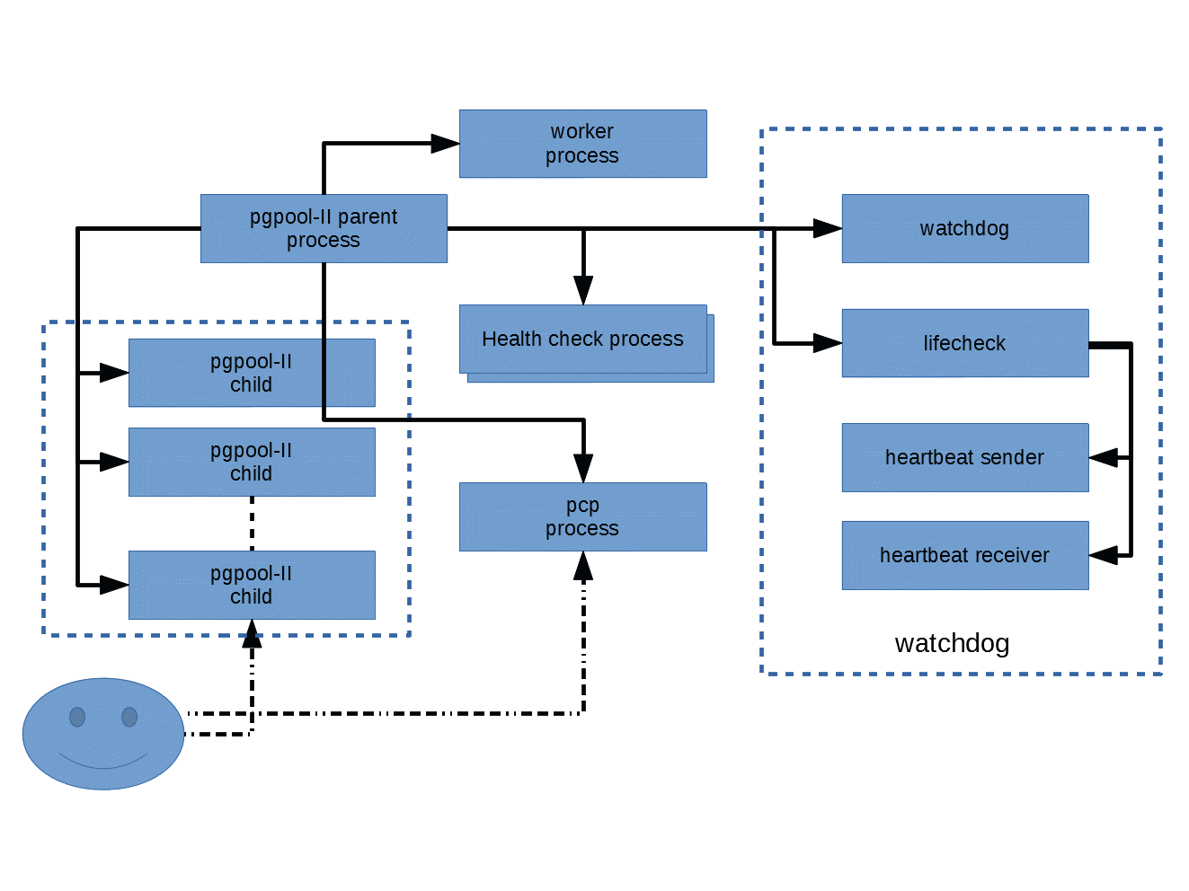 Pgpool-IIは複数のプロセスから構成されます。 他のすべてのプロセスの親となるメインプロセスがあります。 メインプロセスは、クライアントからのコネクションを受け付ける子プロセスをforkする役割があります。 また、メインプロセスからforkされるいくつかのワーカープロセスがあります。 ワーカープロセスは、ストリーミングレプリケーションの遅延を検出する役目があります。 また、「PCPプロセス」と呼ばれる特殊なプロセスがあります。これは、Pgpool-IIの管理専用に使用されます。 Pgpool-IIには、"watchdog"と呼ばれる組み込みの高可用性機能があります。 watchdogはいくつかのプロセスから構成されています。 watchdogの詳細については第4章をご覧ください。