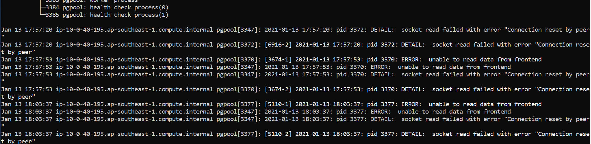 ------ ERROR: unable to read data from frontend DETAIL: EOF encountered with frontend ------ This error may occur because the application doesn't close the connection to pgpool. Does your application use connection pooling to keep the connections open to pgpool? In this case, you may need to specify the parameter "client_idle_limit" to setting a timeout to disconnect a client if it remains idle since the last query. For example, client_idle_limit = 60; https://www.pgpool.net/docs/latest/en/html/runtime-config-connection-pooling.html#GUC-CLIENT-IDLE-LIMIT |