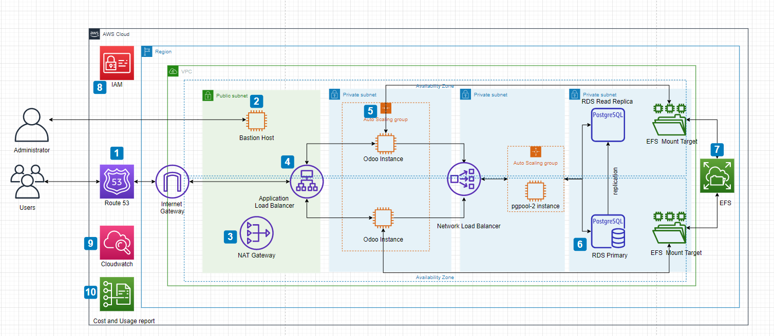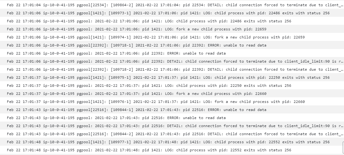 | Description | We are using pgpool version 4.2.1 (Release Date: 2020-12-23), which is middleware between Odoo web server and AWS RDS Postgres. Our purpose is to use pgpool for load-balancing READ queries between master instance and read-replia instance in AWS RDS. Our issue: After a few client connections, web server showed that it couldn't connect to database. We restarted pgpool service, it's working well but the DB connection problem still occured after few client connections. We tried to connect web server directly to AWS RDS, it's working normally. I've attached some information as the following: 1) Our architecture 2) Logs on web server 3) Logs on pgpool 4) pgpool configuration file | ||||