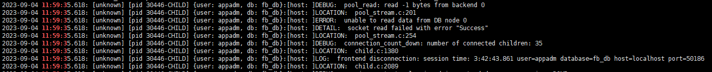 > 2023-08-22 21:53:14.157: [unknown] [pid 14511-CHILD] {user: appadm, db: fb_db}:[host: ]LOCATION: pool_stream.c:201